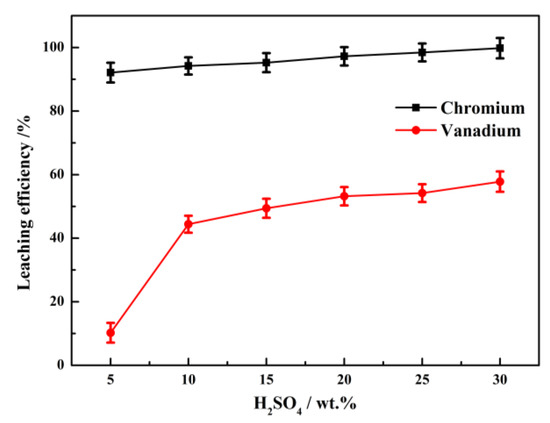 The effect of H2SO4 concentration on leaching efficiency of vanadium and chromium was investigated while keeping the reaction time at 180 min, reaction temperature of 90 °C, and liquid-to-solid ratio of 5:1 mL/g. The concentration of H2SO4 was set as 5 wt.%, 10 wt.%, 15 wt.%, 20 wt.%, 25 wt.%, and 30 wt.%. The results are detailed in Figure 3.