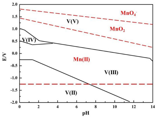 Based on the above discussion, the oxidation of low-valence vanadium is of great importance to further improve its leaching efficiency. It is known that E0MnO2/Mn2+ = 1.21 V and E0(VO2+/VO2+) = 1.00 V, and therefore MnO2 could be used for the oxidation of V(IV) during the leaching process [26,27]. With a summarization of the potential-pH diagram of vanadium and manganese shown in Figure 4, it was clear that the position of MnO2was always higher than that of V(IV) and V(III), indicating that the electrode potential of MnO2was higher than that of V(IV) and V(III). Therefore, MnO2 could oxidize V(IV) and V(III) into V(V). The effect of MnO2 dosage on the leaching efficiency of chromium and vanadium was investigated under the following reaction conditions: reaction time of 180 min, reaction temperature of 90 °C, liquid-to-solid ratio of 5:1 mL/g, and concentration of H2SO4 at 30 wt.%. The results are detailed in Figure 5.