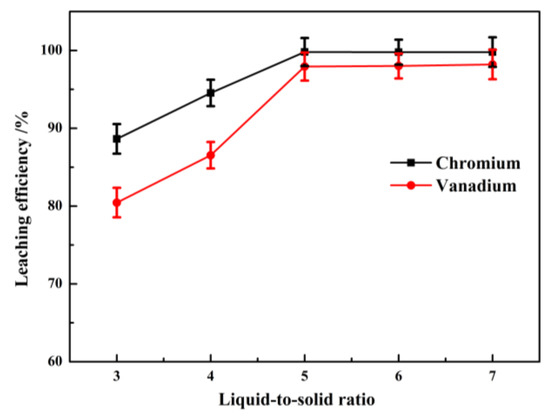 The liquid-to-solid ratio showed a significant effect on the volume of filtrate and concentration of purpose product in the leaching process. A series of experiments were conducted to evaluate an optimal liquid-to-solid ratio to achieve high leaching efficiency of vanadium and chromium. The liquid-to-solid ratio was set as 3:1 mL/g, 4:1 mL/g, 5:1 mL/g, 6:1 mL/g, and 7:1 mL/g, and other reaction conditions were kept as constant: reaction temperature of 90 °C, reaction time of 180 min, dosage of MnO2 at 50 wt.%, and concentration of H2SO4 at 30 wt.%. The results are shown in Figure 8.