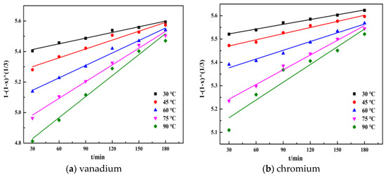 The leaching reaction rates of vanadium and chromium at different temperatures were fitted (Figure 9), and the value of K3 was obtained, where K3isthe reaction rate constant corresponding to the slopes of the straight lines. Then, the specific apparent activation energy could be calculated based on the Arrhenius equations, the results are shown in Figure 10.