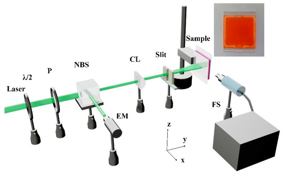 The schematic diagram of the experimental setup. The inset is the optical photograph of the sample. , P, NBS, CL, EM, and FS express the half-wave plate, polarizer, neutral beam splitter, cylindrical lens (focal length of 10 cm), energy meter, and fiber spectrometer, respectively.