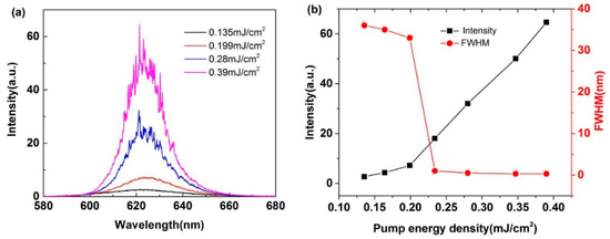 (a) Evolution of the emission spectrum from the DDNLC sample as a function of the pump energy density. (b) The peak intensity and FWHM of the emission spectrum from the DDNLC sample as a function of the pump energy density.
