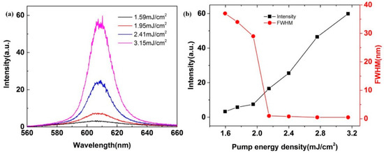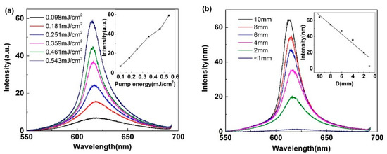 Here, the influence of the width of pump area on the emission spectrum is studied. In this process, the silt is removed. The pump area is an ellipse whose length (i.e., the length of the ellipse’s long-axis) is fixed (about 10 mm), and its width (i.e., the length of the ellipse’s short-axis) can be tuned by changing the distance between the sample and the cylindrical lens. Figure 6a shows the emission spectrum of the NPDDNLC sample at different widths of pump area when the pump energy density is about 0.54 mJ/cm2. According to common sense, the number and the intensity of the discrete sharp peaks should increase with the increase of the pump area because of the increase of the effective region of the system. However, according to our experimental data, the number and the intensity of the observed discrete sharp peaks decrease with the increase of the width of pump area. As we can see in Figure 6a, when the width is shorter than 2 mm, the discrete sharp peaks can be observed clearly. When the width of pump area increases to be larger than 3 mm, the discrete sharp peaks can be observed poorly. Further increasing the width of pump area to be longer than 6 mm, it is difficult to see the discrete sharp peaks. This can be explained by two different reasons: (i) when the width of pump area increases, the light emitted from dye molecules can be amplified not only along the direction of the long side of the pump area, but also along the other directions of the pump area. The number of local modes increases with the increase of the pump area. However, the gain efficiency of the DCM molecules is limited when the pump energy density is fixed. Therefore, the fierce competition between different modes exists. In addition, the emission spectrum along other directions is not collected because the experimental data are collected along the direction of the long side of the pump area. When the gain is occupied by the modes along other directions, the intensity of the lasing modes along the direction of the long side of the pump area decreases, even these modes cannot be excited. (ii) The lasing threshold of different local modes is very similar because the random system used in our experiment is a weak scattering system [40]. When the pump area is small, fewer modes can be excited, and the distance between two adjacent lasing modes is big enough to let us observe clearly some discrete sharp peaks on the emission spectrum. When the width of pump area increases, the lasing threshold of the sample decreases due to the fact that a bigger gain area results in more modes which can be stimulated simultaneously [29]. The resonant modes are coupled to each other and their spectrum will overlap [41]. Therefore, the lasing modes cannot be distinguished. In this case, the emission spectrum is smooth and its characteristics are more like an amplified spontaneous emission (ASE).