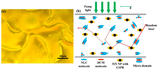 Figure 4a shows the texture of the sample measured by an orthogonal polarizing microscope. Figure 4b shows the schematic illustration of the random laser of the NPDDNLC sample. The non-oriented cells result in the non-uniform alignment of NLC molecules. As shown in Figure 4a, the NLC molecules are self-assembled into many micro-domains and the micro-domain possesses a residual birefringence [37,38]. The orientation of the micro-domains near the inner surfaces of the cell is parallel to the surfaces of the cell due to the weak anchoring force from the inner surfaces of the cell. The orientation of the micro-domains away from the surfaces of the cell is chaotic. Because of the long-range fluctuations of the micro-domain director, the dielectric tensor of NLC molecules is different between the adjacent micro-domains, then the spatial refractive index is not uniform in the cell [39]. The light is confined in the cell and has a longer dwelling time in the cell because of the multiple scattering of micro-domains. This is also the reason why random lasers can occur in the DDNLC samples. In addition, the introduction of TiN nanoparticles into the DDNLC solution can enhance the emission spectrum by two mechanisms. On the one hand, the electromagnetic field around TiN nanoparticles is enhanced by the LSPR of the TiN nanoparticles. This effectively increases the pump absorption and the fluorescence amplification efficiency of the DCM molecules around TiN nanoparticles. On the other hand, the scattering strength of the sample is enhanced by adding TiN nanoparticles into the sample. This makes that the dwelling time of the light in the sample is increased markedly. When the gain exceeds the loss, the random laser occurs.