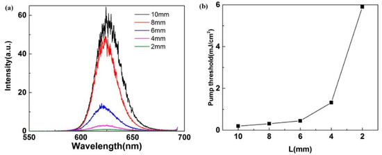 In order to study the influence of the length of pump stripe on the emission spectrum, an adjustable slit is added in front of the sample as shown in Figure 1, which can change the length of pump stripe illuminated on the sample. Figure 5a shows the emission spectrum of the NPDDNLC sample as a function of the length of pump stripe, when the pump energy density is 0.52 mJ/cm2. The emission intensity decreases with decreasing the length of pump stripe from 10 mm to 2 mm. In addition, the number of the discrete sharp peaks decreases markedly with the decrease of the length of pump stripe. As we can see in Figure 5a, the discrete sharp peaks disappear when the length of pump stripe decreases to be less than 4 mm. This is because the gain length of the photons emitted from the dye molecules reduces with the decrease of the length of pump stripe. The effective region of the system [40], defined as the pump region plus the absorption length, decreases with the decrease of the length of pump stripe, which makes the reduction of the random laser modes in the sample. When the length of pump stripe decreases to a given value, the discrete sharp peaks will disappear due to the fact that the gain is smaller than the loss. It also means that the pump energy is lower than the threshold. Figure 5b shows the pump threshold of the NPDDNLC sample as a function of the length of pump stripe. The pump threshold increases with the decrease of the length of pump stripe. When the length of pump stripe is longer than 6 mm, the pump energy density (0.52 mJ/cm2) is larger than the pump threshold. Therefore, the discrete sharp peaks can be observed. When the length of pump stripe is shorter than 4 mm, the pump energy density is lower than the pump threshold. Therefore, the random laser action cannot occur.