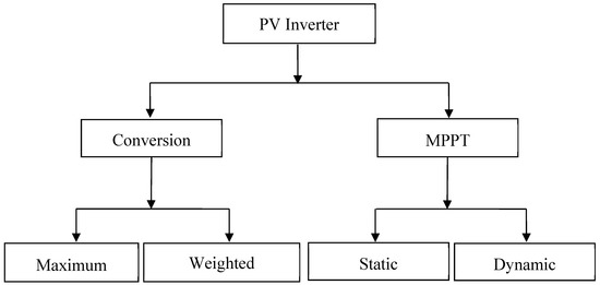 Figure 1 depicts the tree diagram of PV inverter efficiency classification. It has two components: the conversion (ηinv) and the maximum power point tracking (MPPT) efficiency (ηMPPT). The ηinv is simply the ratio of the output (ac) power to input (dc) power, and is directly related to the efficiency of converter hardware. On the other hand, the ηMPPT reflects the ability of the MPPT algorithm to tracks the maximum point on the P-V characteristic curve at any instant. It is the ratio of the actual power that is extracted from the module to the maximum theoretical power that can be achieved from the P-V curve. The ηMPPT influences the power converter by adjusting its duty cycle so that it always operate at the maximum point for a given temperature and irradiance level. The total efficiency is defined as the multiplication of ηinv and ηMPPT [10]. This work concentrates on the ηinv, as the MPPT efficiency has already been extensively covered elsewhere [11].
