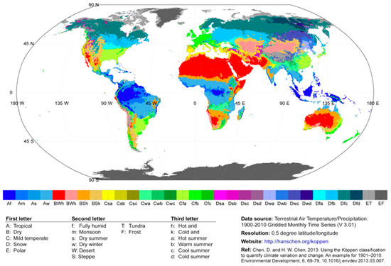 - Peel, M.C.; Finlayson, B.L.; McMahon, T.A. Updated World Map of the Koppen-Geiger Climate Classification. Hydrol. Earth Syst. Sci. 2007, 11, 1633–1644. [Google Scholar] [CrossRef]
