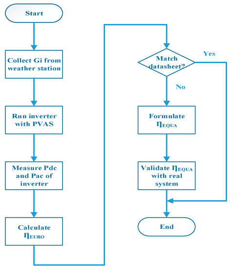 Prior to installation, the photovoltaic (PV) system provider (PVSP) performs a site survey to determine the suitability of the location and to propose the most appropriate system design. Then, the energy yield (Esys) prediction report will be provided to the customer. This report allows for the return of investment (ROI) or the payback period to be calculated and correspondingly, the financial capital can be secured [1]. One important element in the Esys calculation is PV inverter conversion efficiency. For convenience, many PVSP use the maximum (peak) efficiency (ηmax) value from the inverter datasheet to compute Esys [2,3]. However, it has to be noted that the ηmax refers to the maximum achievable conversion efficiency of the dc-ac power converter (or inverter) under the standard test condition (STC) (STCs: Irradiance: 1000 W/m2, Temperature: 25 °C, Air Mass: 1.5 AM). In practice, the PV system rarely operates at STC. For example, in a region that experiences the Equatorial climate, the STC condition is achievable only for a limited period of the day. At most times, the system is subjected to a much lower irradiance (G). Moreover, the operating (module) temperature (T) is typically in excess of 35 °C throughout the day [4].
