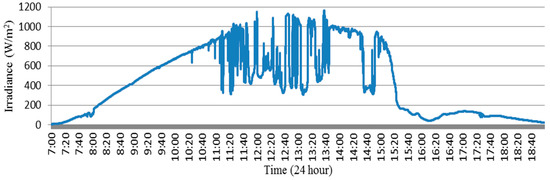 Figure 6 shows the in-plane irradiance (Gi) profile, logged by the weather station on 9 April 2014 [4]. The data is sampled in one second. The profile characterizes a typical day of Equatorial weather: clear sky early in the morning until midday before shifting to a cloudy sky later in the day. However, to produce a one year daily average, a one minute average sampling time is suggested by the IEC 61724 [20], as well as by the Australian PV System Monitoring Guideline (2013) [21]. Based on these recommendations, the one second sampled data (taken from 1 January 2014 to 31 December 2014) is averaged to one minute. In this paper this dataset is known as the “Equatorial data”.