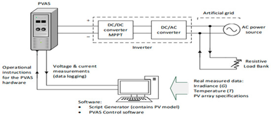 Figure 7 depicts the overall block diagram used to measure the efficiency of the inverter, while Figure 8 shows the photograph of the actual laboratory test set-up. The Gi data from the weather station was converted into a specific format that is readable using the PVAS. Since the data is obtained from crystalline modules, the same technology was set in the PVAS parameters setting. Furthermore, the critical inverter specifications, i.e., Voc, Isc, Vmpp, and Impp were also specified [7]. The output of the PVAS was connected to the tested inverter and the latter was tied to the grid. To avoid measurement uncertainties (due to the voltage and frequency fluctuation), the grid was emulated using an ac power source, connected to a resistive load. The ratio between the module power and the dc side power of the inverter was set to 1:1. This ratio is recommended by references [25,26]. The electrical properties of the inverter, namely the input dc (VDC, IDC) and output ac (Vac and Iac), were logged using a PM 6000 power analyzer. From these quantities, the Pdc and Pac were computed, respectively. Four inverters with different technologies and ratings were tested. Their specifications are described in Table 2.
