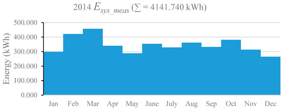 The weighted efficiency which results in Esys_diff being the closest value to zero can be considered to be the most appropriate setting for the Equatorial region. The real PV system is a 3 kW roof-top grid-connected system with a 1:1 (PV module: inverter) sizing ratio. The array comprises of twelve 255 W monocrystalline modules, facing South at 10° tilt angle. The strings from the panels are connected to a SB3000HF inverter. As suggested in references [2,3], the Esys calculation is only valid when the data is logged for one year. Figure 10 shows the energy produced, logged throughout the year 2014. The total Esys_meas for the year is 4141.7 kWh. The computed values Esys_calc using ηmax, ηEURO, and ηEQUA are shown in Table 11. The Esys_diff are 99.10, 59.47, and 6.63 kWh, respectively. Clearly, the computation using ηEQUA results Esys_diff is nearest to zero. Thus, it can be concluded that ηEQUA is the best option to represent the inverter efficiency for the Equatorial region.