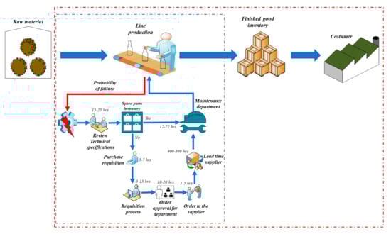 BPE is a glass bottle manufacturing company located in the state of Veracruz, Mexico. The company produces glass bottles from different types of raw materials. In the model that we propose (see Figure 1), we assume a one-to-one relation to simplify the analysis of raw materials. When a mechanical failure occurs randomly (black dotted lines), BPE’s maintenance department proceeds to identify the problem. If the part needed to fix the machine is on-site, repair time lasts from 12 to 72 h. However, if the company needs to purchase the needed part, BPE’s production line may be stopped for a much longer period of time. The red dotted lines holistically depict the key processes that are compromised during mechanical failures, including finished goods inventory and order shipping. Order shipping is the performance indicator that we evaluate in this research.