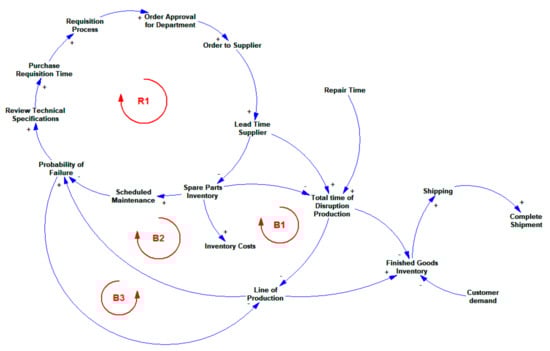 Loop R1. Variable Probability of Failure refers to the failure of any machine part in the production line, which triggers the activation of a spare part procurement process. This process involves different stages: technical specifications review, purchase requisition time, requisition process, order approval, order to supplier, and supplier lead time. Also, the procurement process is extensive and causes spare parts to arrive late in inventory, thus increasing the value of variable Scheduled Maintenance.