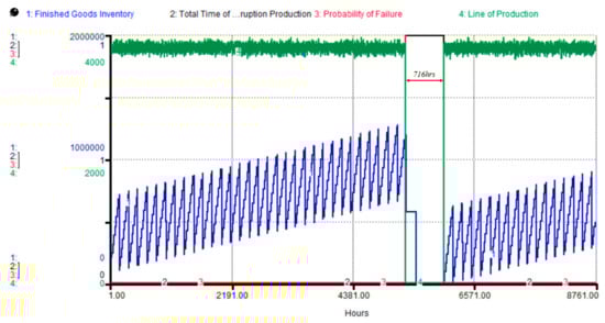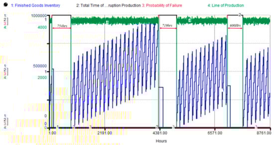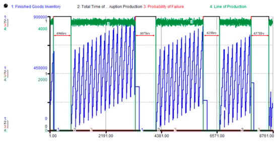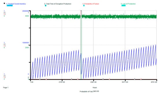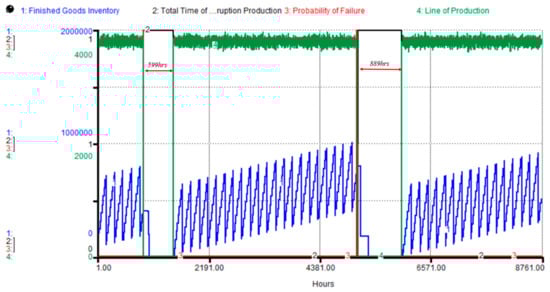 We ran the simulation model for the first time using the values listed in Table 1. According to the results, depicted in Figure 3, the mechanical failure occurs in hour 3463. Then, the process of replacing the damaged part and repairing the machine begins. If the spare part needed is in stock, the production disruption lasts 68 h, i.e., 20 h for technical inspection and machine dismantling and 48 h for part replacement. Additionally, during the disruptive event, the level of finished goods inventory decreases, yet it does not compromise scheduled deliveries, since the disruption lasts only for a short time.
