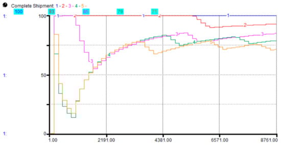 We ran the model several times to determine its robustness and find out what could happen if three disruptive events occurred in BPE’s production line within a year. As Figure 6 illustrates, the first disruption occurred in hour 78 and lasted for 754 h. The second disruptive event occurred in hour 4332 and lasted for 719 h. Finally, the third disruptive event happened in hour 7059 and lasted for 600 h.