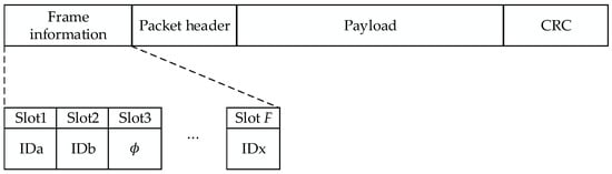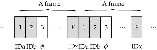 Each vehicle is equipped with a Global Positioning System (GPS) receiver, and time is synchronized with the aid of GPS. If the GPS signal is lost, other distributed schemes can be used to synchronize vehicles []. In the system, channel time is partitioned into frames consisting of equal time slots, as shown Figure 1. Each node maintains two sets of neighboring nodes: one-hop set (OHS) and two-hop set (THS) according to the frame information (FI) exchanged among its one-hop neighbors. The OHS or the THS is a group of vehicles that can communicate with each other with maximum one-hop or two-hop communication, respectively. To avoid hidden/exposed node problems, nodes in the same THS are not allowed to reserve the same slot. Hence, before reserving a slot, a node must listen to the channel for at least consecutive slots (not necessarily in the same frame). As shown in Figure 2, each node transmits its one-hop neighbors’ IDs, and their reserved slots in the FI are contained in the header of a packet. Thus, by listening to the channel, a node can get its THS neighbors’ IDs and their reserved slots and then choose one unreserved slot to access. A node releases its time slot if it fails to detect its ID in FIs from at least one of its one-hop nodes [].