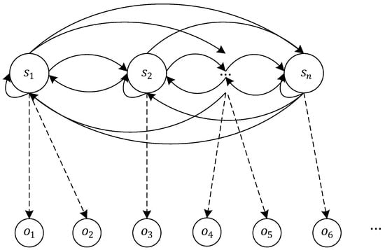 To perform the cooperative rebroadcasting, the source node broadcasts the cooperation pattern along with the safety message in the labeled packet to its one-hop neighbors. The cooperation pattern contains the IDs of the predicted target nodes, the required number K of helpers, and the required times of retransmission. Usually, the method to find out which nodes do not receive the labeled packet after broadcasting relies on ACKs or negative acknowledgements (NACKs) sent back by the nodes in OHS of [,]. However, the introduction of an ACK/NACK mechanism inevitably incurs extra delay, which is not suitable for safety messages with the strict delay demand. Therefore, we propose a hidden-Markov-model (HMM)-based method to predict the target nodes, i.e., the nodes that most likely fail in receiving the labeled packet. Let denote the set of the predicted target nodes.
