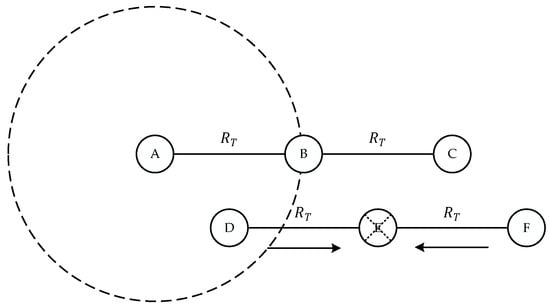 Condition (1) is easily understood, because a node can be a potential helper only when it has received and decoded the packet successfully. However, why is condition (2) still needed? As shown in Figure 5, nodes B and D are the one-hop neighbors of node A. Node F is a two-hop neighbor of node D, and its position is beyond node A’s range. Thus, nodes F and A can reserve the same slot. If node D is selected as the helper and transmits a packet in node A’s slot, a collision will happen on node E, because nodes F and D transmit in the same slot. Thus, node D cannot be selected as the potential helper. Therefore, when a node receives the labeled packet successfully, it first checks whether any node in its THS occupies the same slot with the source node. If no, it becomes a potential helper and will contend to be a helper in the following slots.