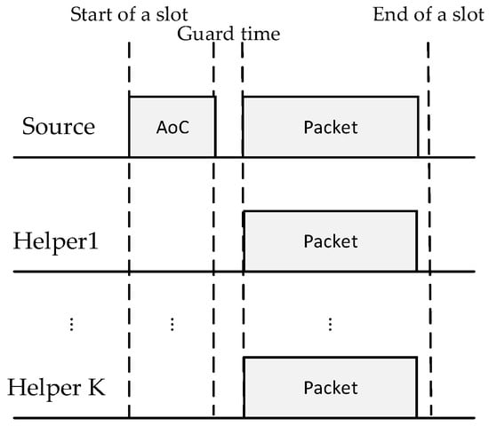 In the next slot of the source node, the source node transmits an acknowledge for cooperation (AoC) at the beginning of the slot. The AoC message indicates the ID of the selected helpers and the time to cooperate. Then, in the remaining part of the slot, the selected helpers retransmit the packet with the source node cooperatively, as shown in Figure 6. If there is no helper, the source node retransmits the packet in its slot alone. Then, the cooperative retransmission goes back to the original way of repetition-based broadcasting. The cooperative broadcast is performed times in the coming slots of the source node.