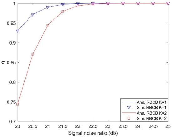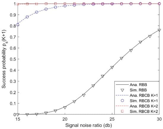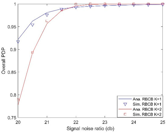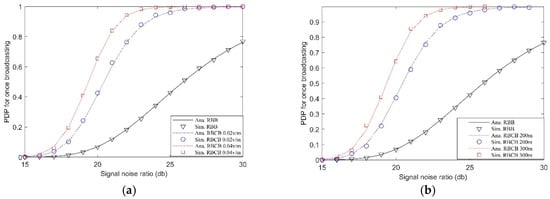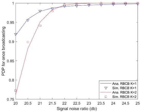 Figure 13 and Figure 14 compare the PDPs of RBCB with K = 1 and K = 2. The changing trends of the curves in Figure 13 and Figure 14 are the same. When the SNR is small, the PDPs for K = 1 are higher than that for K = 2. When the SNR becomes greater, the PDPs for K = 2 become higher than that for K = 1. The reason is as follows. When the SNR is low, the probability of the occurrence of the cooperative broadcasting for K = 2 is much smaller than that with K = 1. Although the success probability for once broadcast for K = 2 is greater than that for K = 1, the PDPs of RBCB are still lower than those of RBB. When the SNR is high, the probability of the occurrence of the cooperative broadcasting for K = 2 is close to that for K = 1. Therefore, the PDPs for K = 2 become greater than those for K = 1.