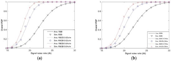 Figure 8 illustrates the PDPs of RBB and RBCB schemes for once broadcasting. In Figure 8 and Figure 9, the number of helpers is set to one. In Figure 8a, the transmission range is set to 200 m, and the density of vehicles is changed from 0.02 vehicles/meter (v/m) to 0.04 v/m, while in Figure 8b, the density of vehicles is set to 0.02 v/m, and the transmission range is changed from 200 m to 300 m. According to Figure 8, the PDP of RBCB for once broadcasting is significantly improved compared to RBB scheme. Furthermore, the PDP of RBCB for once broadcasting is even greater when the density of vehicles is 0.04 v/m (Figure 8a) or the transmission range is 300 m (Figure 8b). This is because an increase in vehicle density or transmission range raises the number of potential helpers, which means the probability of cooperative broadcasting is also increased. In addition, the PDPs of RBCB and RBB schemes for once broadcasting are almost 0, when the signal noise ratio is 15 dB. This is because almost no nodes can receive the packet when the channel is very poor. Thus, no potential helpers exist, and the probability of cooperative rebroadcasting is very small. Figure 9 plots the overall PDPs of RBCB and RBB schemes. In order to meet the required PDP, a packet may need to be broadcasted more than one time. Here, the required PDP is set to 0.95, when the signal noise ratio is 30 dB. In order to meet the required PDP, the labeled packet is broadcasted three times for RBB scheme, while it is just broadcasted two times for RBCB scheme. Even so, the PDP of RBCB is still greater than that of RBB, because cooperative rebroadcasting significantly improves the PDP for once broadcasting.
