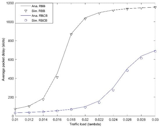 Figure 10 shows the comparison of the average packet delay of RBB and RBCB schemes. In Figure 10, the number of helpers is set to one. It is observed that the average packet delay of RBCB is shorter than that of RBB. This is because the cooperative broadcasting decreases the times of broadcasting it needs to meet the required packet delivery probability. For RBB, it needs three times of broadcasting to meet the required packet delivery probability, while for RBCB, it just needs two times of broadcasting to meet the required packet delivery probability. Thus, the delay that a packet waits in the buffer of the source node is significantly decreased. Furthermore, the improvement is more significant when the traffic load is medium. The reason is as follows. When the traffic load is low, both RBB and RBCB schemes can transmit the packets in time, and then few packets wait in the buffer. When the traffic load is medium, the buffer congestion of RBCB is better than that of RBB, and the waiting time in the buffer of the source node becomes shorter. When traffic load is high, both RBB and RBCB schemes cannot handle the overwhelming packets.