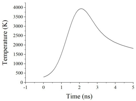 Figure 2. The point reached the peak temperature of 3900 K at 2.1 ns after the laser began to heat the surface. The temperature of the target mostly depended on the effect of the laser heating and the thermal diffusion in the volume. Before 2.1 ns, laser heating occupied a dominant position resulting in the fast rise of the temperature. Then, after the transient balance at 2.1 ns, the temperature was mostly affected by the thermal diffusion. After 3.2 ns, at the end of the laser pulse, the temperature was still mostly determined by the thermal diffusion effect. It was worth noting that the peak temperature of the central point far exceeded the melting point and evaporating point of copper. Therefore, the irradiated surface would be melted and evaporated by the laser irradiation.