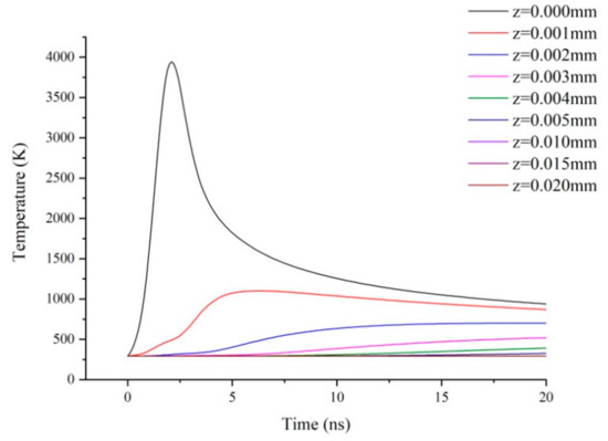 Figure 4. The laser energy was delivered into the volume and caused the temperature to rise. With the depth increasing, the peak temperature of the corresponding point was decreasing. When it reached 20 μm, there was almost no temperature rise. The size of the sample was much larger than the beam radius and heat penetration depth. Therefore, the temperature rise of the whole sample induced by laser heating could be neglected. Based on that, we could expect that there was no temperature accumulation to the whole sample by multiple pulses of laser irradiation.
