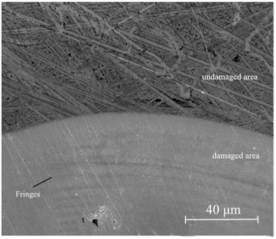 Figure 5, the melting part was only a small area in the whole damaged area. In most parts of the damage, the fluence of the laser was not high enough to trigger evident melting or evaporation behavior on the copper surface. However, the irradiation of the laser modified the surface into a different condition presenting a contrast with the color of the unabated area under SEM detection.