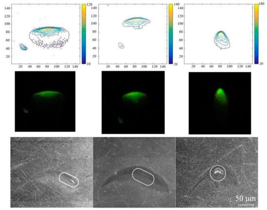 Figure 7. The first row in the picture was the contour map obtained from the intensity of the visible spot. The color bar showed the scale of the relative intensity of the spot. The intensity of the laser spot and transformed visible spot were not in a linear relationship. However, the intensity distribution of the visible spot indicated the general condition of the intensity distribution of the focused laser spot. The third row was the corresponding damage pattern at each position. The white lines circled the melting position. To compare the three rows, the shape of the laser spot and the damage pattern were coincident. In each position, the melting occurred at the position under the laser irradiation with a higher intensity, which indicated a higher fluence.