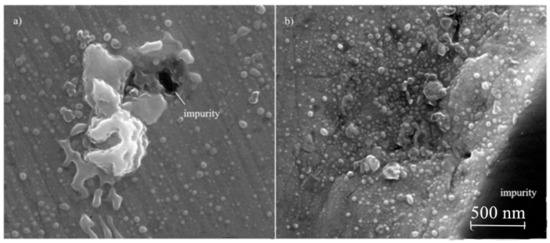 Figure 10b. Since the target was located vertical to the beam path and nearly vertical to the horizontal plane, most of the nanoparticles were drop-down because of gravity. Since the plasma expansion occurred near the surface of the target, there are still some particles left on the surface, which showed strong evidence that the surface behavior was drastic due to the irradiation of the laser. Phase explosion would occur during the interaction. Based on that, the thermal effect was strongly involved in the interaction. In future research, the mica sheet would be used below the target to catch the nanoparticles ejected from the surface to study the size distribution. In the ablation area, it was also found a large melting area around the impurities inset the copper surface, as shown in