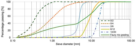 The design of the mix has been made using the Faury method, to obtain maximum compactness. The maximum aggregate size has been set at 20 mm, in accordance with EHE-08. The coarse aggregates (>4 mm, EN 13139) of the reference concrete (NAC) have been replaced at several ratios (20%, 50%, and 100% vol.) with CRA. The content of cement has been set at 350 kg/m3 and the effective w/c ratio of the reference concrete (NAC) at 0.5. The total w/c ratio has been determined by adding compensation water equal to that estimated for the mixing time (10 min) from the water absorption over time test, according to the method proposed by Rodrigues et al. [58]. The strength class of concrete has been defined as C30/37 in accordance with EN 1992-1-1. The slump has been defined as 70 ± 10 mm (S2) according to EN 12350-2 and without plasticizers (in order not to introduce more variables) for all replacement ratios. To maintain the same slump in all the mixes, the effective w/c has been slightly modified. RAC has been manufactured from the theoretical curve of NAC (Figure 1), maintaining between mixes the same volume of aggregates of each sieve fraction, so the mix grading for NAC and for RAC is the same. The mix proportions used are shown in Table 3.