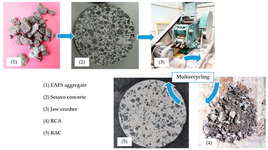 A scheme illustrating the successive steps of RAC’s manufacturing process is shown in Figure 2. The process describes the possible multi-recycling of RAC.