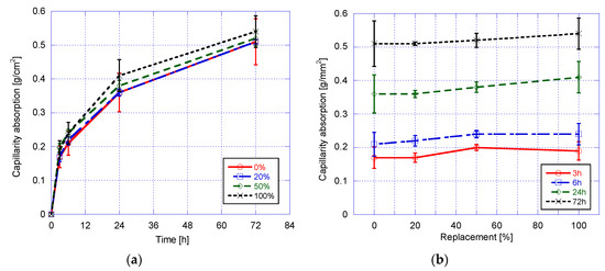 Capillarity absorption vs. time (a) and capillarity absorption vs. replacement ratio (b).