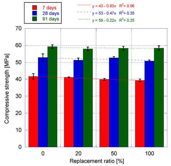 At 7 days, the compressive strength decreases slightly and linearly as replacement increases. For 100% replacement, the strength loss with respect to NAC is 5.5%. At 28 days, the concrete class for all replacement is C35/45, exceeding the C30/37 class proposed at the design phase. At 28 days, a strength loss or gain depending on the replacement cannot be clearly defined, but a relative 7-day strength increase of 21% for NAC and 23% for RAC with 100% of RA is observed. This slightly higher relative increase for high replacement could be due to a hydration of the unhydrated cement grains of the old mortar, thus improving the bond in the ITZ with the new mortar. So the curing age is an important factor to check the effectiveness of these concrete mixes. At 91 days, the replacement level does not affect compressive strength. The slope of the linear adjustment is practically 0 and the standard deviation close to 1 for all replacements, proving an increase in compressive strength with age and replacement ratio, because the old mortar is still hydrating. In any case, the compressive strength obtained is much lower than that of the source concrete, although relatively higher than that obtained in other studies for current CDW [9,17,27,32,33,34] which on average lose around 10% compressive strength at 28 days with respect to NAC. This is due to the high quality of the RCA used in the present study, namely the high strength of the attached mortar of these CRA (due to the strength of the source concrete) and its low shape index.