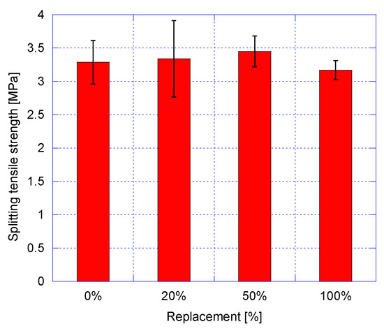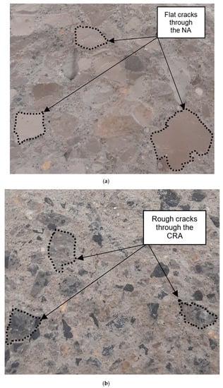 The results of the splitting tensile strength tests are shown in Figure 5. The high standard deviation, which is typical of splitting tensile strength tests [33], and the similar mean values obtained show that the behaviour of RAC is very similar to NAC’s for any replacement ratio. This happens because there is a good bond strength between RCA and the new paste, due to the higher roughness of RCA. This greater roughness seems to compensate for the weaker mortar surface generated in the crushing stage and exposed in the new ITZ. It also compensates for RAC not benefitting from the bond produced by the chemical interaction between calcium hydroxide and the calcareous aggregate [59] in NAC. As seen in Figure 6, fracture surfaces propagate through the aggregates (good bond strength in the ITZ), both for NAC and RAC. In the case of NAC, the crack surface is flatter, favored by the crystalline structure of calcite, while the fracture surface produced in CRA is irregular or lumpy with a smooth transition to the new mortar paste. Most of the macro-cracks present in RCA are produced in the mortar phase of the source concrete, even though sometimes they are also produced through the EAFS aggregate.