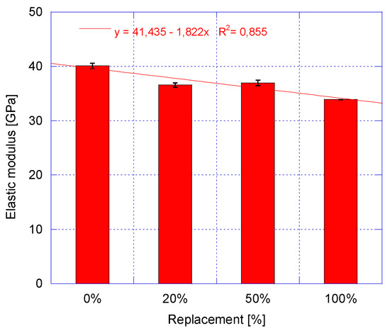 Figure 7 shows the compressive modulus of elasticity for all mixes produced. Using a linear trend line, an inverse relationship between modulus of elasticity and replacement level can be established. While NAC shows a 40 GPa modulus of elasticity, the 100% replacement mix shows values around 33 GPa, 17% lower and with standard deviations not exceeding 0.5 MPa. This reduction is lower than that commonly reported and is related to the properties of the source concrete. The source concrete used to produce RCA has low w/c ratio, a modulus of elasticity greater than 50 GPa and a low porosity close to 10%. For similar w/c ratios and cement contents, other authors reported reductions from 15% to more than 40% [15,35,61] using RCA produced from common concrete waste.