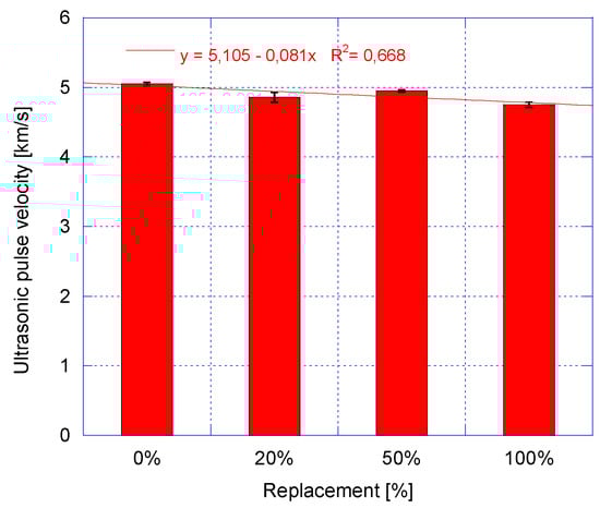 Ultrasonic pulse velocity is intrinsically related to the modulus of elasticity and density. The ultrasonic pulse velocity obtained for all the mixes produced is shown in Figure 8. Following the trend line, it is observed that the pulse velocity decreases as the replacement ratio increases. There is a maximum loss of 6% for 100% replacement, slightly less than 9% determined by Khatib [52] for current RAC with the same w/c ratio. It should be remarked that the source concrete showed an ultrasonic pulse velocity of 5.22 km/s at the same age. On the other hand, the maximum loss obtained is similar to that obtained by de Brito et al. [10] for RAC produced from concrete precast rejects, which demonstrates the homogeneity of RAC and the high quality of the RCA used. The RCA used in this study has a density 10% and 20% higher than NA and of current RCA respectively, which a priori favours an increase in the ultrasonic pulse velocity. On the other hand, the porosity of the source concrete mortar allows RAC to strain more under sustained loads, obtaining smaller modulus of elasticity and lower ultrasonic pulse velocity than NAC, due to the discontinuities generated by the pores.