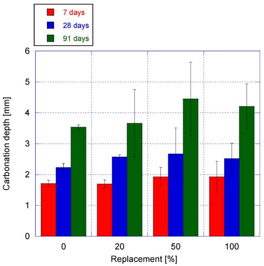 Other authors have also obtained increases in carbonation depth as the replacement level increases. For similar mixes and 100% replacement, de Brito et al. [10] obtained a marginal increase of the depth of carbonation for rejected high-quality precast concrete at all ages tested. Ryu et al. [62] obtained a slight increase in carbonation depth for similar mixes and similar compressive strengths, namely an increment of 14% for total replacement. Finally, in the review of Silva et al. [45], it is found that, for total replacement, the average carbonation depth may increase by a factor of 2 with respect to the control concrete, establishing the permeability of concrete, which depends directly on the water absorption (and therefore on the open porosity) of RCA, as a key factor.