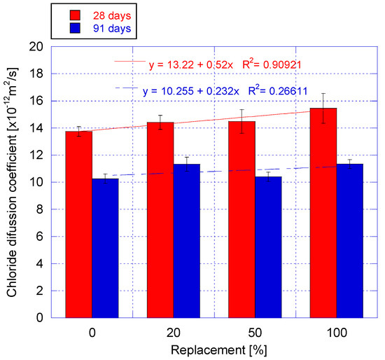 Chlorides negatively affect concrete, reacting with tricalcium aluminate forming Friedel’s salt (bound chlorides) and oxidizing the reinforcement after penetrating concrete (free chlorides) [63]. The resistance to the penetration of chlorides is shown in Figure 10. The chlorides diffusion coefficient increases with replacement ratio and decreases with age. At 28 days, there is a quasi linear increase in this coefficient, reaching 11% for total replacement. At 91 days, the increase is 9.5% for total replacement, due to the extra contribution of mortar from the source concrete that continues to hydrate. On the other hand, there is a large reduction in chlorides diffusion coefficient with age, a reduction greater than 25% for all replacements.