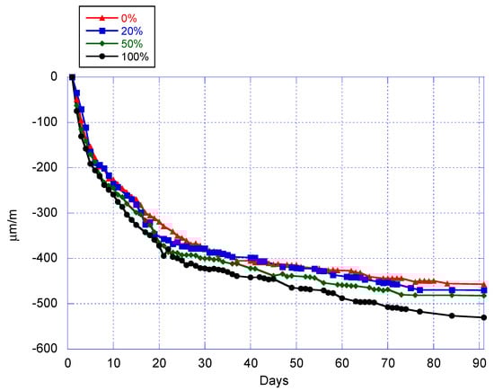 It is well known that there is a strong relationship between drying shrinkage and modulus of elasticity in concrete [65]. The shape and texture of aggregates are variables that affect the drying shrinkage, although modulus of elasticity (or any of the variables that affect the latter) is the parameter that most affects the former [59]. An increase in modulus of elasticity generates a greater restriction against strain, i.e., stiffer aggregates more efficiently oppose the strain generated by shrinkage than more deformable ones. As stated before, the modulus of elasticity drops with increase of the replacement ratio (17% for full replacement) and drying shrinkage decreases similarly. Another factor to keep in mind is that RCA is still shrinking, especially if the source concrete is young concrete, while NA do not shrink. Recycling concrete that has already reached the end of its service life is not a problem, but in the case of laboratory-produced concrete (the case here) it is something to keep in mind. Shrinkage measured from RAC with laboratory-produced source concrete is thus expected to overestimate the shrinkage of RAC. Losses for total RCA replacement range from 10% [10] to 50% [43], the latter being the value established in the Xuping review as a typical value for RAC.
