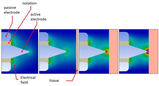 First, the electrodes are placed away from the tissue, and then the gap between two electrodes is ionized. Due to ionization process, an electric arc discharge develops. In this approach, tissue burning is more superficial because the current is spread over the tissue area more than over the tip of electrode. The experimental set-up provides high-frequency power dissipation in the vicinity of the tip. This was demonstrated in the histological analysis by showing that there is more of a cutting effect in the tissue than coagulation, because there is no tissue nor cell denaturation in the cutting channel and surrounding tissue (Figure 3).