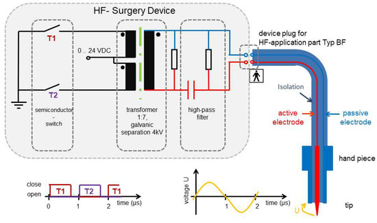 Bearing in mind that the vaporization or cutting process is the best accomplished with relatively low voltage, the coagulation is performed by arcing modulated high-voltage current to tissue. The electric arcs create cell bursts through the evaporation of cell content. By modulating the voltage, it is possible to cut and at the same time make locale coagulation. There is a galvanic separation between the power source and the surgery hand piece (Figure 2).