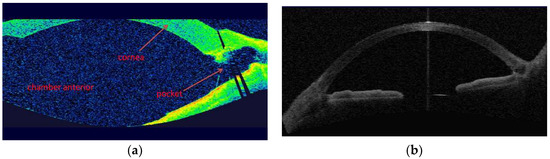 (a) OCT image of the anterior chamber: Overview after HFDS procedure with a newly created pocket in the chamber angle (Visante OCT, Zeiss, Oberkochen, Germany). (b) OCT image of the anterior chamber of a normal angle anterior before HFDS surgery.