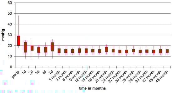 Mean preoperative IOP in the study population of 205 patients was 24.5 ± 4.3 mmHg (range 18 to 48 mmHg). Decimalised Snellen visual acuity (VA) increased from 0.46 ± 0.27 preoperative to 0.68 ± 0.27 postoperative. For all patients, the follow-up was 48 months. After 10 days, a slight increase of IOP was detected but was not statistically significant. Mean IOP after 48 months was 15.0 ± 1.7 mmHg (range 10 to 20 mmHg). The IOP drop was statistically significant (p < 0.001) at all measured postoperative intervals (Figure 6).