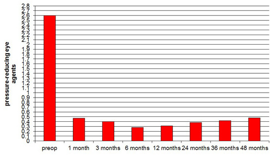 Progression of pressure-reducing eye agents pre-and postoperative during the 48 months, showing a marked and sustained postoperative reduction in numbers of agents needed.