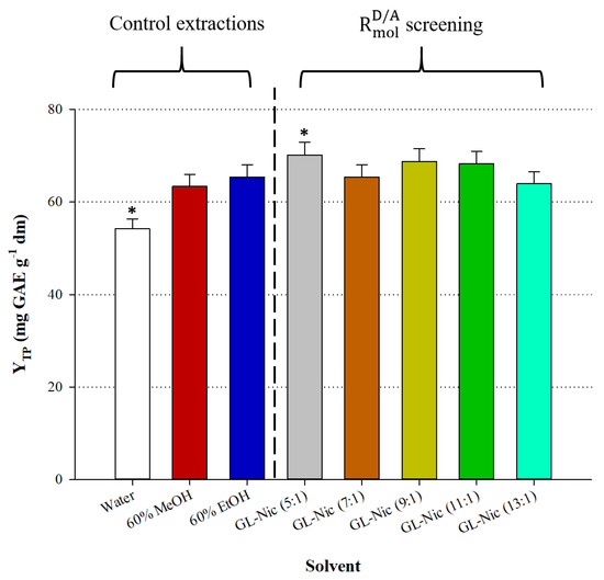 Plot showing the effect of on the extraction effectiveness of the DES tested. Extractions were carried out at 50 °C, with CDES = 70% (w/v), at 500 rpm, for 150 min. Assignment with “*” denotes statistically different value.