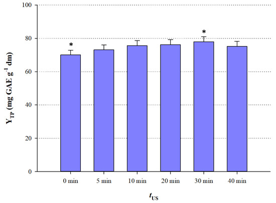 The effect of ultrasonication time (tUS) on the extraction yield of total polyphenols. Extractions were performed with the 70% (w/v) aqueous GL-Nic (5:1), at 23 °C and RL/S = 35 mL g−1 dm. Assignment with “*” denotes statistically different value.