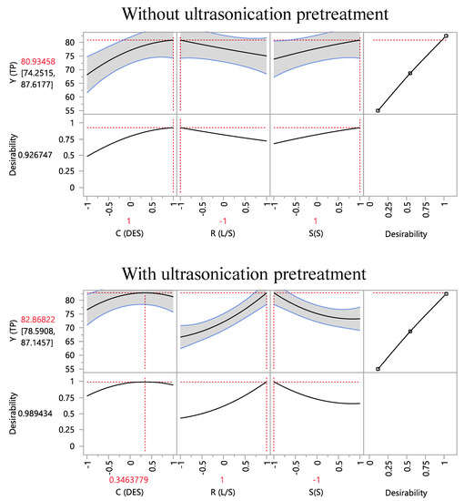 The impact of the ultrasonication pretreatment could be more characteristically depicted by the changes found in the optimization settings of all three variables. Pretreatment resulted in shifting the theoretically required DES amount from 85% to 75% (w/v), RL/S from 20 to 100 mL g−1, and SS from 800 to 200 rpm (Table 5). This outcome suggested a profound influence of ultrasonication on the pattern through which the process variables can affect polyphenol extraction. On the other hand, it is to be emphasized that the ultrasonication pretreatment exerted virtually no effect on the extraction performance, since the optimal predicted values for YTP, for the extraction without and with pretreatment, had no statistically significant difference, being 80.93 ± 6.68 and 82.87 ± 4.28 mg GAE g−1 dm, respectively (Table 5).