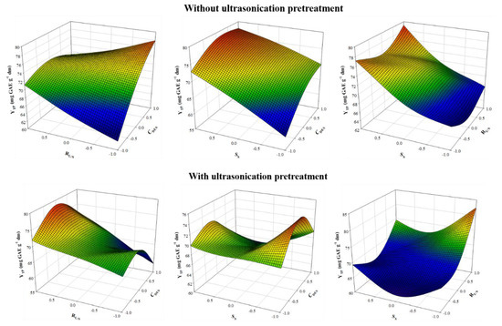 Ultrasonication of samples prior to stirred-tank extraction had a very pronounced effect on the extraction models, as can be concluded by the equations derived (Table 3). Thus, while CDES (X1) had a positive contribution in maximizing YTP in the extraction without ultrasonication pretreatment, it negatively affected the ultrasound-pretreated extraction. On the contrary, increased SS (X3) was significant for maximizing YTP in samples received no pretreatment, whereas ultrasound-pretreated samples required the lowest SS used to give maximum YTP.